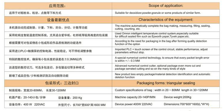 1.彩色触摸屏和稳定可靠的双轴高精度输出的PLC控制,制袋、计量、充填、封合、打码、切袋一次完成。